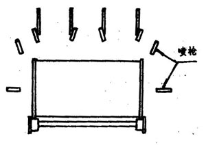 高压无气喷涂喷枪距工件的垂直距离大致在250-400mm, 根据我们的使用情况看,压力调整至15MPa时距离取300mm为宜。相邻两枪喷涂范围应略有复盖。对于桶底盖喷枪的安放,一把应与端面垂直,并对桶底盖中心有一定的偏移,另一把则装于钢桶端部之斜上方,以保证桶口盖凹边处及中心部位皆可喷到油漆。喷枪位置调定后,不可随便移动。如图示。