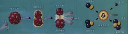 原子核中蕴藏着巨大的能量,原子核的变化(从一种原子核变化为另外一种原子核)往往随着能量的释放。如果是由重的原子核变化为轻的原子核,叫核裂变,如原子弹爆炸,核电站也是通过核裂变发电;如果是由轻的原子核变化为重的原子核,叫核聚变,如太阳发光发热的能量来源。
