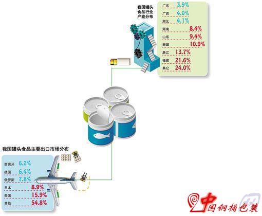 我国的罐头行业是典型的出口型行业,一直保持较快的发展速度,其中蘑菇罐头、番茄酱罐头、柑橘类水果罐头以及鱼类罐头等是我国罐头行业出口的拳头产品,产 品在国际市场也久享盛誉。虽然根据罐头食品的种类不同,对应的出口市场也有比较大的差别,但综合大部分罐头产品的出口情况来看,日本、美国和欧洲依然是我 国罐头食品的主要出口市场,其中排列前五的国家分别为美国、日本、俄罗斯、德国和西班牙,它们占据了我国出口罐头食品的一半左右。
