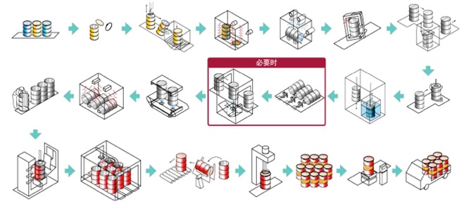 流程:接收(对旧钢桶进行分选)→预洗(以不容易清洗的油污为对象,通过蒸汽及清洗剂低压清洗桶内部)→残液抽出装置(抽出经蒸汽加热后桶内的残液)→卷边整形(矫正钢桶上下卷边变形)→桶体整形(固定钢桶顶、底,向桶内注入压力不大于400KPa的压缩空气,并通过压轮矫正桶体凸凹)→清洗剂清洗以及高压清洗(向桶内喷射清洗剂,并用高压水进行清洗)→残水抽出(利用抽水管将桶内残留水份抽出)→脱水烘干(残水抽出的上方加热板发出远红外线,起烘干作用)→空气置换(吸出桶内水蒸气,置换桶内空气)→内部检查(对钢桶内部清洁度进行,可使用小型CCD摄像机)→研磨清洗(桶内放入砂子及清洗剂进行旋转清洗)→酸清洗(旋转平台上酸洗、水洗、中和。清除桶内锈蚀)。