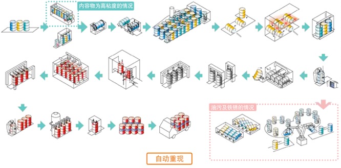 接收(对旧钢桶进行分选)→分解(开口桶分选同时,拆去桶箍和桶盖)→残液回收(将桶内残液剥离后,使钢桶倒置,并回收残液)→焚烧(温度约700℃下,焚烧桶内残余物质)→喷丸处理(喷射钢丸,清除附着在钢桶内、外表面焚烧渣及锈蚀等)→清除钢丸(以真空方式吸除留在桶底的弹丸)→桶体整形(矫正桶体的凸凹)→桶边整形(矫正卷边部变形)→渗漏检验(将桶浸入水中,并使桶内成负压状态,利用真空检查渗漏状况)→刷洗(必要时,利用刷磨桶内部)→高压清洗(旋转喷嘴,利用约25MPa的水进行喷射清洗)→表面处理(利用磷化、锆化等进行覆膜处理和防锈处理)→脱水烘干(利用热风烘干桶内水份)→内部检查(只有钢桶内部检查合格品才能进入下道工序)→内表面涂装(高压无气喷涂)→低温烘干→内表面涂装(高压无气喷涂)→高温烘干→外表涂装(高压无气喷涂)→烤漆烘干→冷却装置(从下面喷射气体,使其冷却)→安装桶盖和桶箍(利用桶箍安装机进行安装)→标记(采用指定标记)→计量器(称重)→产品出厂。