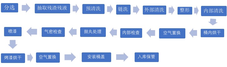 流程:接收、拆解→接收后检查→回收残液→预洗(用水清洗容器内部)→药剂清洗→内部检查和局部清洗(清洗注入口和阀门)→喷淋冲洗(用清水冲洗容器内部)→吹干(除去水份)→内部检查并装设部件(阀门等)→气密检查(容器内负压,检查气密状况)→内部干燥(热风烘干)→最终检查并安装部件→产品出厂。