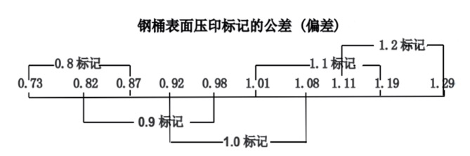 允许偏差(即,“公差”)即钢板的厚度已经在国际标准和美国的危险品规定中被认可。对一个标记为0.8的钢桶,不同钢板制造出来可能会有所不同,因为满足标记为:0.8的钢板,其实际厚度是在0.73到0.87毫米(公差为:±0.07)之间。显然,这样钢桶的用户会有一些疑问。然后就规定,桶身标记“0.8”的钢桶必须满足最小点厚度为0.82毫米。(钢板厚度为1.1或1.2毫米时,可能会有所不同,其实际厚度公差为± 0.09毫米)。