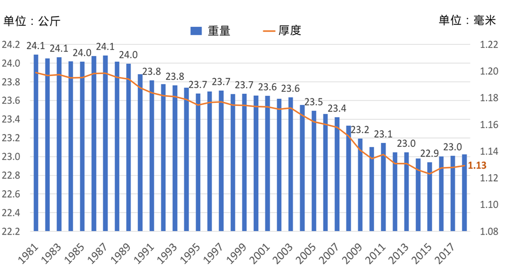 下面是日本和中国多年来生产钢桶的厚度图表。