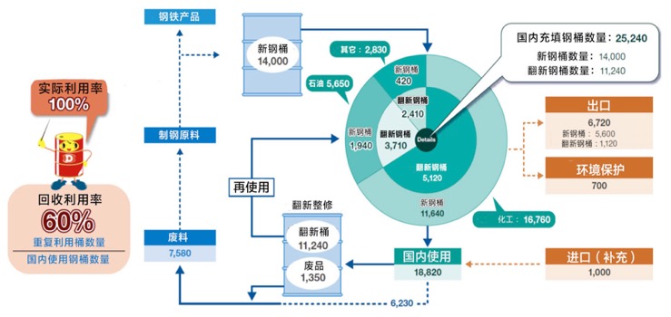 我们先看日本,日本在钢桶回收再利用方面做的比较很好,所有新钢桶厂都有旧桶回收翻新生产线。日本钢桶的回收再利用率为60%。