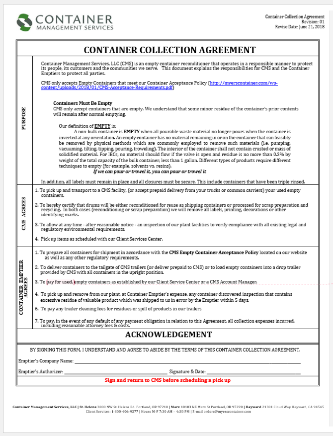 只有托运人在每次装载容器后,证明符合上述要求之后,CMS才能接收容器。该证明会附在我们的旧钢桶接收记录中。每次取件均由CMS驾驶员(司机)和托运人双方签名,并且一式二份,正本带回公司存档,副本留给客户。