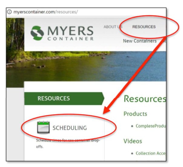 ◆ 若要安排卸车时间,请访问网站:www.myerscontainer.com页面顶部的“资源”标签,如图所示: