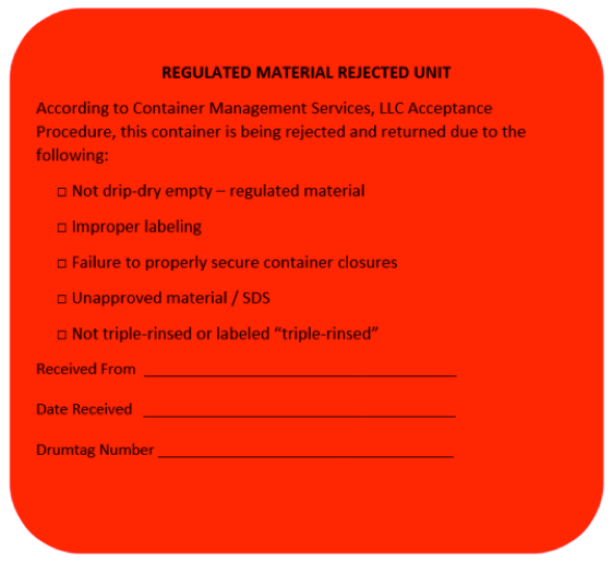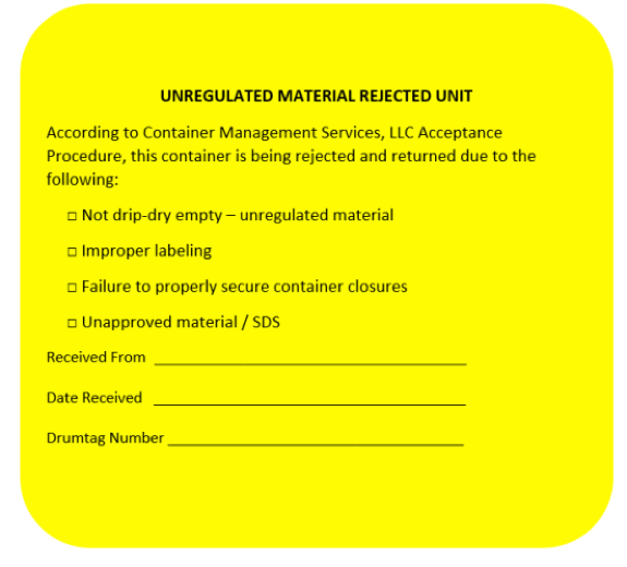 ◆未受《资源保护和回收法》管制的材料的有效期:如果在5个工作日内未取回被拒收的容器,或者未同意向清旧钢桶收取$ 60 /桶或$ 120 / IBC的处置费用,CMS将向当地执法机构举报容器清空单位或个人。与拒收单位有关的费用,包括运费,手续费和管理费,将由货方(清旧钢桶方)承担。
