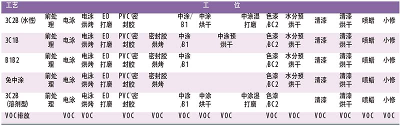 伴随着涂料的发展,乘用车整车厂涂装工艺进入了一个高速发展的时代,典型工艺有传统溶剂3C2B工艺、水性3C2B、高固溶剂3C1B以及B1B2等工艺,以上典型的涂装工艺流程基本上都是由电泳、涂胶、中涂、面涂以及烘烤等工艺的不同组合来达成,5种典型工艺的现状见表1所列。