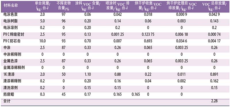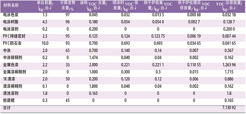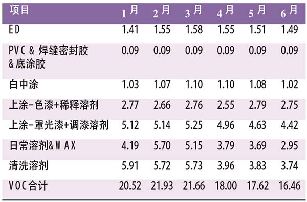 由表1我们可以大概地掌握整个涂装车间产生VOC的工位。如何对VOC总排放以及各工位的排放进行统计收集,这就需要建立一个VOC大数据库,即在生产过程中,对各工位的材料消耗以及生产车辆数进行数据采集,然后结合材料特点,对各工位的VOC量进行确定,每月对这些基础数据进行收集、计算,形成大数据库。然后对这些数据进行各种对比、分析,在掌握车间VOC排放的现状的同时进行改善点的识别,采取措施,达到减少VOC排放的目的。