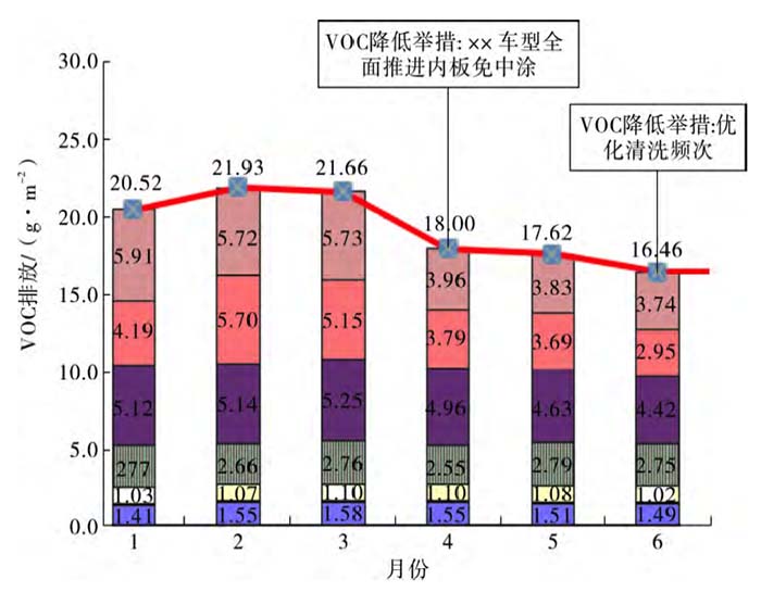 然后,收集当月喷漆处理面积,将各工序按单位面积VOC排放计算,即将表2~3各工位VOC排放理论计算表按月统计到表4中,同时在EXCEL表格中设计公式,自动形成柱状图(见图1)。同时在柱状图上将当月所实施的VOC降低举措进行标注,这样形成一个原始的数据库。