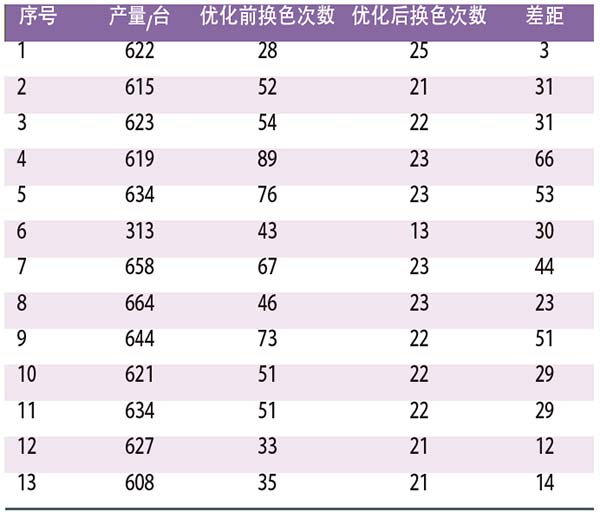 集中喷涂同种色漆,可以快速有效降低VOC排放。在进入面漆前进行颜色编组,同色面漆集中喷涂,减少换色清洗,从而减少换色溶剂的使用量。机器人同一颜色连续喷涂的最大台数为50台,如按照每35台清洗1次对产品进行排序,优化后与优化前换色情况结果见表5。