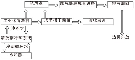 由于溶剂具有可挥发性,由其配制的复合清洗剂也具有这一特性。本技术在清洗剂使用及回收过程中,泛清洗剂暴露在空气中的工序,都安装了收集处理系统,使其不能挥发到大气,污染环境。见图5、图6。