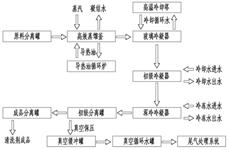 蒸馏釜设计采用了便于拆卸的上法兰结构,方便蒸馏釜拆装,利于对蒸馏釜内部进行清洗,减少污垢,提高传热系数;采用独特的釜残排放方式,可以快速有效的排放釜残;高效玻璃盘管式冷凝器的设置,初步冷凝蒸馏釜蒸发出来的气态溶剂,同时现场操作人员还可以直观清晰的观察到馏出液的外观品质及汽相、液相的运行情况,利于操作和安全保障。通过把使用后的复合清洗剂进行减压蒸馏、配制等再处理,使复合清洗剂达到循环使用的目的,大大地降低了清洗剂的用量。