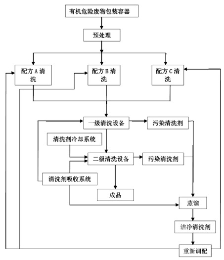 在清洗有机危险废物包装容器时,需要使用大量清洗剂才能把有机危险废物包装容器清洗干净。若清洗剂不做再生循环使用,将大大增加清洗成本,使清洗有机危险废物包装容器的成本明显提高。