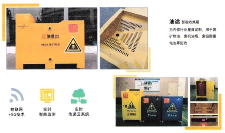 为解决小微企业危险废物贮存管理混乱的问题,公司自主开发了一套智能终端——“油途”智能收集箱。该智能收集箱主要用于废矿物油、废机油格、废铅酸蓄电池等汽修行业产生危险废物的贮存、回收。箱体安装有测重仪、液位传感器等装置,用于准确称量箱内废物的存储量,内嵌的通信模块利用4G/5G技术,将数据信息实时传输到管理平台,可实时了解危险废物贮存量信息,实现危险废物的“在线储”。
