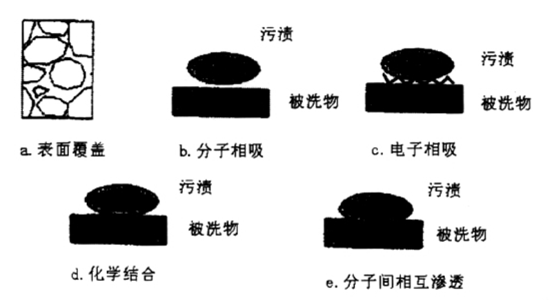 在决定清洗方法时,需弄清被洗物的特性和污垢的性质。要掌握被洗物所用材料的物理性质是属于易受损伤表面还是坚硬表面,与洗涤剂是否起化学反应等。对于污垢,在选用合适的清洗方式时,还要看其黏附状态、所属种类等污垢的黏附状态(如图一所示),从机械性的覆盖至渗透、扩散到被洗物内部,有各种各样的状态。状态a可较容易地除去,但状态e要完全除去是困难的,对被洗物的损伤不可避免。各种状态都需要通过考虑综合使用合适清洗力,完成清洗。