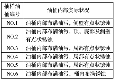 根据表一可以看出,大部分油桶内部布满油污,局部有点状锈蚀,而对于锈蚀较多的油桶己经失去了清洗意义,不能再用。