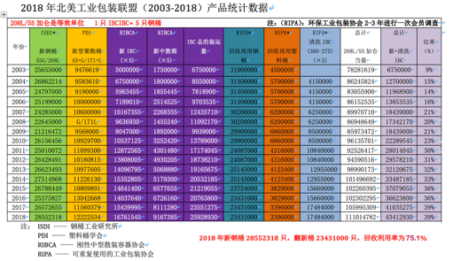 我们先看日本,日本在钢桶回收再利用方面做的比较很好,所有新钢桶厂都有旧桶回收翻新生产线。日本钢桶的回收再利用率为59.3%。