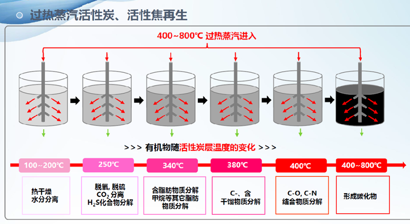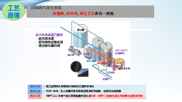过热蒸汽再生系统是含吸附,反冲洗,再生工艺多合一系统。分为三道工序,分别为制水工序:系统通过活性炭孔隙吸附污染物及过滤把水净化;反冲工序:气冲+水冲,防止因悬浮物导致的活性炭顶部褪色,结块及沟道现象;再生工序:100℃以上水蒸气通过再加热器升温生成400~800℃过热蒸汽通过喷射管向活性炭喷射,活性炭(活性焦)吸附的有机物被高温脱附、裂解或碳化。