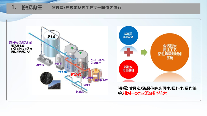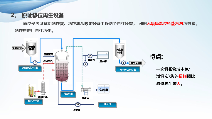 原地址移位再生是通过移送设备将活性炭、活性焦从吸附装置中移送至再生装置,利用无氧高温过热蒸汽对活性炭、活性焦进行再生活化。