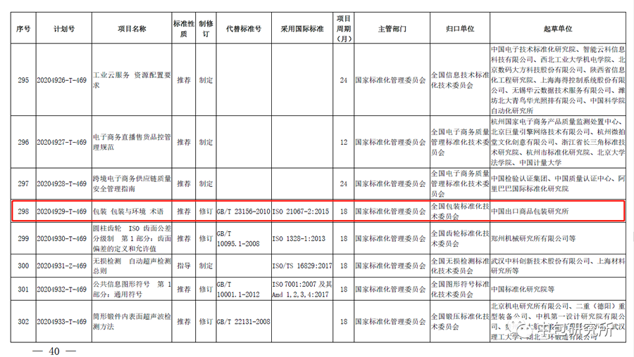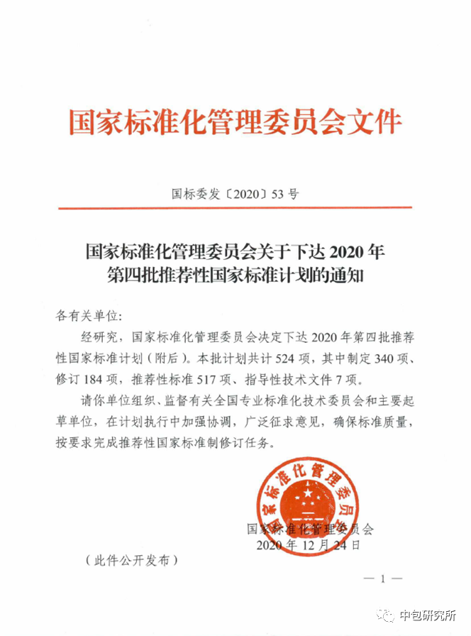 2020年12月24日,国家标准化管理委员会印发了国标委发 [2020] 53号《国家标准化管理委员会关于下达2020年第四批推荐性国家标准计划的通知》。其中,由全国包装标准化技术委员会归口,中国出口商品包装研究所牵头起草的GB/T 18455《包装回收标志》(计划编号20204878-T-469)和GB/T 23156《包装 包装与环境 术语》(计划编号20204929-T-469)等两项国家标准修订项目获准立项。