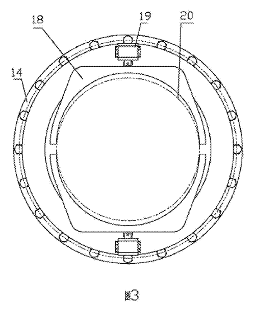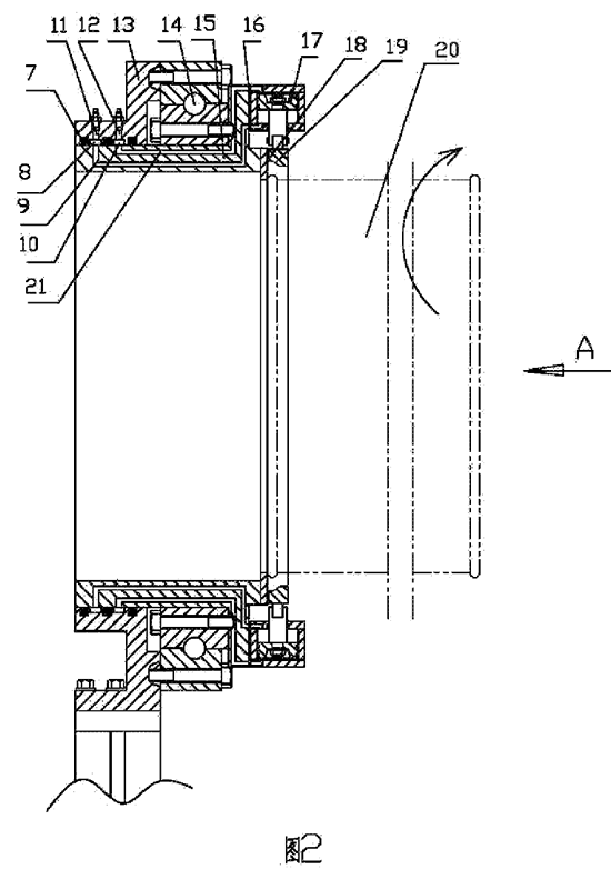 本发明钢桶抛光装置的示意图如图1所示,包括主机架1、钢桶内壁打磨机构2、外抛光机构、卡桶机构5、桶旋转电机6、桶升降机构4,所述主机架1上安装有钢桶内壁打磨机构2,所述钢桶内壁打磨机构2的一侧安装有外抛光机构,所述钢桶内壁打磨机构相对处旋转电机6连接,所述钢桶内壁打磨机构2与所述卡桶机构5之间安装有桶升降机构4,在钢桶内壁打磨机构2前端与桶口相应的位置安装有桶口定位机构3,所述桶口定位机构的示意图如图3和图4所示,包括转盘轴承14,所述转盘轴承14的内圈通过螺栓与内连接套15固定连接,所述转盘轴承14的外圈通过螺栓与外连接套13固定连接,所述内连接套15的端部与桶口相对应的位置安装有汽缸17,所述内连接套15内分别设置有与汽缸进气口连通的进气通道21和与汽缸出气口连通的出气通道9,所述进气通道21与所述外连接套上的环形进气凹槽10相接,出气通道9与外连接套上的环形出气凹槽8相接,所述环形进气凹槽10上设置有进气孔12,环形出气凹槽8上设置有出气孔11,所述外连接套与内连接套相接处环形进气凹槽10和环形出气凹槽8的两侧分别安装有密封圈7,所述汽缸17的活塞杆端部连接有卡环19,所述卡环19与内连接套的15端面之间安装有与内连接套固定的挡圈18,所述汽缸17与内连接套15之间安装有垫片16。