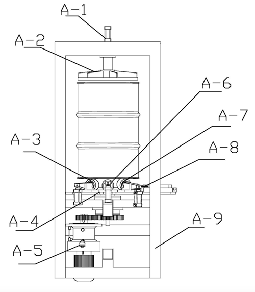 本实用新型立式落盖机的结构示意图如图1所示,包括机架A-9、下压盘A-2、下压盘驱动机构A-1、托盘A-4、托盘旋转驱动机构A-5、开缝单元A-3、扒缝单元A-6、展压单元A-7及切边单元A-8。所述开缝单元A-3、扒缝单元A-6、展压单元A-7、切边单元A-8及下压盘驱动机构A-1安装于所述机架A-9上。所述下压盘驱动机构A-1与所述下压盘A-2连接驱动所述下压盘A-2移动。所述托盘旋转驱动机构A-5与所述托盘A-4连接驱动所述托盘A-4旋转。所述下压盘A-2与所述托盘A-4相对设置。所述开缝单元A-3、扒缝单元A-6、展压单元A-7及切边单元A-8沿桶底圆周方向设置。
