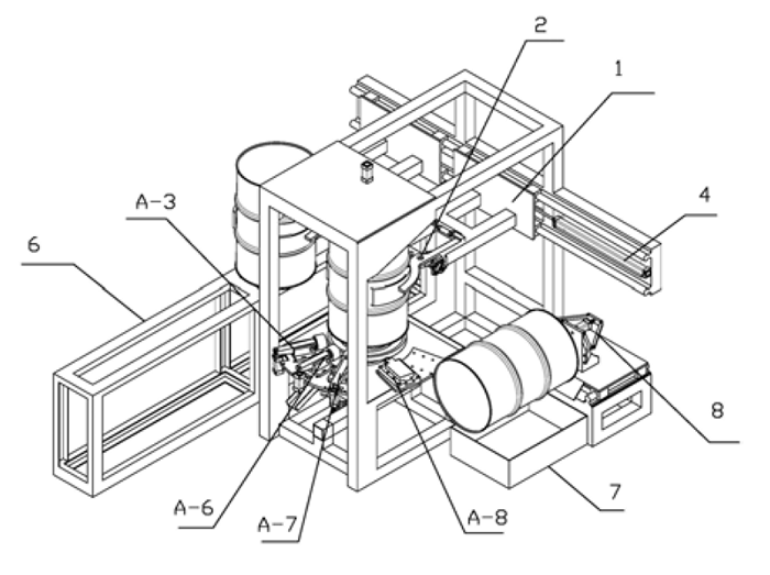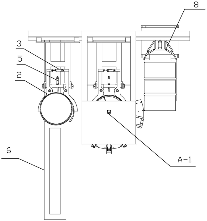 本实用新型立式落盖系统的结构示意图如图2-图4所示,包括桶移位单元、立式落盖机A、桶输送机构6、托桶架7及卸盖机构8。所述立式落盖机A位于落盖工位处,所述桶输送机构6位于上桶工位处,所述托桶架7及卸盖机构8位于卸盖工位处。本实施例中的桶输送机构6采用链式输送机。所述桶移位单元包括移位拖车1及移位驱动机构4,所述移位拖车1上安装有抱桶夹2、抱桶夹扭转驱动机构5及抱桶夹夹紧驱动机构3,所述移位驱动机构4与所述移位拖车1连接驱动所述移位拖车1移动。所述抱桶夹夹紧驱动机构3驱动所述抱桶夹2抱紧或松开钢桶。所述抱桶夹扭转驱动机构5驱动所述抱桶夹扭转一定角度,使桶由立式转成卧式。根据使用需要可以设置两组桶移位单元,分别位于上桶工位及落盖工位。所述立式落盖机A的结构如图1所示,包括机架A-9、下压盘A-2、下压盘驱动机构A-1、托盘A-4、托盘旋转驱动机构A-5、开缝单元A-3、扒缝单元A-6、展压单元A-7及切边单元A-8。所述开缝单元A-3、扒缝单元A-6、展压单元A-7、切边单元A-8及下压盘驱动机构A-1安装于所述机架A-9上。所述下压盘驱动机构A-1与所述下压盘A-2连接驱动所述下压盘A-2移动。所述托盘旋转驱动机构A-5与所述托盘A-4连接驱动所述托盘A-4旋转。所述下压盘A-2与所述托盘A-4相对设置。所述开缝单元A-3、扒缝单元A-6、展压单元A-7及切边单元A-8沿桶底圆周方向设置。所述移位拖车1与所述机架A-9滑动配合。
