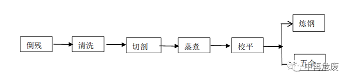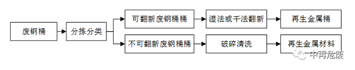 再生金属材料,是指将废钢桶内、外壁所沾染的含有毒性、腐蚀性等危险物质清除后,经过撕碎、破碎、压制、压平、磁选、团粒、压块等方式制备成团状、板状和块状等一定规格形状的金属材料。破损不能翻新再生的200 L废钢桶、翻新3次后的200 L废钢桶、200 L以下废钢桶,则经过清洗、破碎后制成金属板材或金属团粒进行再生利用。目前采用的工艺流程有“去残→清洗→切盖/剖桶→清洗→压平”、“去残→撕碎→清洗→破碎/团粒→磁选→二次清洗→脱水”。处理过程中产生废气、废水和废液,应对其进行相应处理后进行排放。