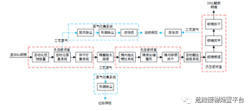 干法技术区别于水洗、溶剂洗技术,主要通过物理手段,实现200 L废钢桶桶内残料及桶壁油漆的去除和翻新,整个工艺过程中不添加任何化学物料,无工艺废水产生;工艺处置过程均在密闭的空间内进行并确保封闭空间的强负压,所产生的工艺废气均实现了密闭空间内高效收集,同时,生产出的翻新钢桶内也无任何异味,确保整个过程不存在无组织排放,并配有旋风+布袋+活性炭等高效、成熟及稳定的废气处置工艺对废气进行处置,处置后废气排放可达到GB 16297标准。
