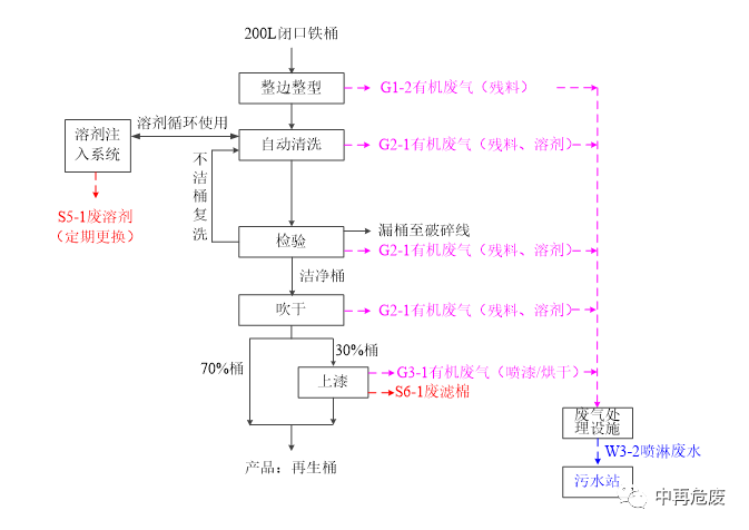 湿法清洗,根据废钢桶残液种类不同使用不同类型的清洗剂,将废钢桶内、外壁所沾染的含有毒性、腐蚀性等危险物质进行冲洗清除,使废钢桶获得再生的过程。目前,市场上常见添加的清洗剂有溶剂(如二甲苯)、碱液和洗涤剂等。主要工序为“去残→落盖→清洗残余物→打磨→干燥→整形→表面喷漆”,处理过程中产生的废气、废水和废液,需对其进行规范处理。国内现已投入使用的全自动湿法翻新生产线,在来料管理、设备的自动化、设备安全性以及工艺的合理性方面均得到了显著的提升。