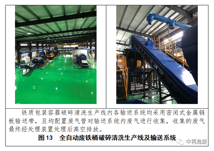回收的废桶按照类别进行科学分类后,按照不同类别不同批次进行破碎,破碎系统采用全封闭自动化设备,物料输送由输送带完成,不进行人工输送,减少了人工风险。破碎后的自动化清洗设备为全封闭结构,清洗过程产生的微量废气集中进入废气净化系统,确保达标排放。