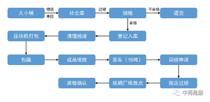 湿法技术适合复杂来料,包括铁质闭口桶、铁质开口桶、塑料闭口桶、吨桶等多元桶类的翻新再利用。对于回收后的包装桶进行严格分类后进行分别翻新利用,无法再利用包装桶进行破碎后再利用,将包装桶的利用做到彻底。