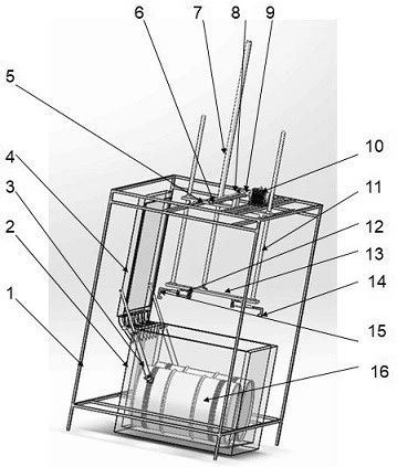 图中,基架(1)、液氮槽(2)、液氮槽处液压缸(3)、槽盖(4)、齿条支撑板(5)、齿条(6)、齿轮(7)、联轴器(8)、伺服电机(9)、升降气压缸(10)、升降导杆(11)、夹紧气压缸(12)、夹持机构安装板(13)、夹紧钩(14)、夹紧钩(15)、铁桶(16)。