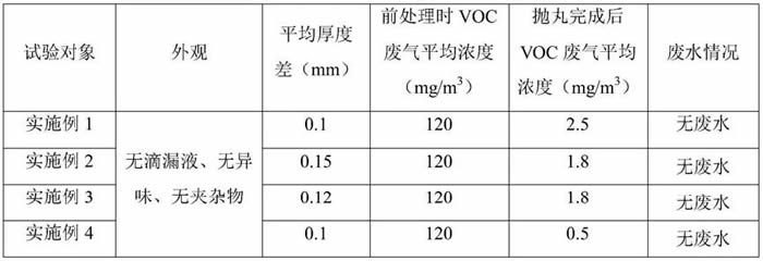 同时抛丸步骤产生的废气、部分离散的固体废渣和粉末经由尾气收集机构收集后排入到尾气处理装置中进行集中处理,检测达标后经由排气筒排放。其中,尾气处理装置选自布袋除尘器。本申请的布袋除尘器可以选择YDL-G型高温布袋除尘器(易得力),也可以选择YDL滤袋式除尘器(易得力)。