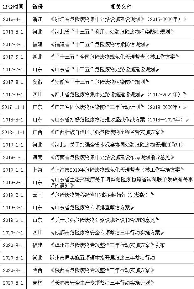 在地方层面,也有诸多省市发布关于危废处理的中长期规划文件、以及危废专项整治三年行动方案,进一步驱动了工业危废处理行业的需求释放及上升。在具体的目标方面,浙江、四川、陕西关注危废集中处置能力;山东关注危废利用能力;广东关注危废处理率。此外,河南、陕西、湖北、四川、福建等地相继开展危废专项整治三年行动。