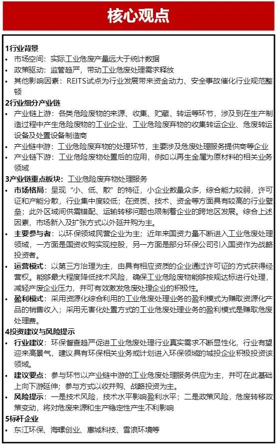 由于危险废物处理服务提供商为该行业的关键主体,且多数企业在产业链布局上涵盖收集、转运、处置等上中游环节,因此要对工业危废处理服务板块进行重点研究。