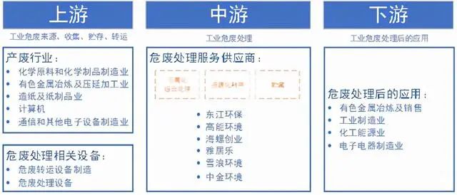 具体来看,上游主要为各类危险废物的来源、收集、贮藏、转运等环节,涉及到在生产制造过程中产生危险废物的工业企业、工业危险废弃物的收集转运企业、危废转运设备及处置设备制造商;中游则主要为工业危险废弃物的处理环节,主要涉及危废处理服务提供商等企业;下游则为工业危险废物处置后的应用,例如以再生金属为原材料的相关业务领域。