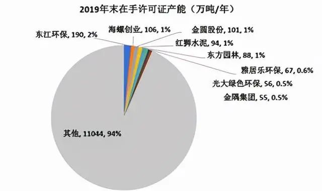 我国工业危废处理市场格局呈现“小、低、散”的特征:尽管参与者众多,但是小企业数量众多,整体的规模和生产能力较小,在技术、资金、研发等方面的能力较弱,处置资质也较为单一。据统计,从许可证数量和产能情况所反映的危废处理能力前八名企业合计占比仅为6.4%(如图2),整体而言行业集中度低。其主要原因在于工业危废处理行业的壁垒较高,主要体现在资质、技术、资金等方面。此外,区域分布带来的运输转移问题也限制着企业跨地区发展,合作基础形成的信任关系也会影响企业获取危废的来源及处置单价。