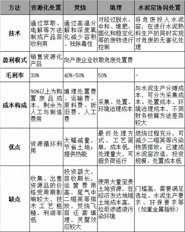 具体的,根据工业危险废物的处理方式不同,在盈利模式上也有区别。目前我国工业危废处理方式主要以资源化综合利用和无害化处置两种方式为主,其中无害化处置又包括填埋、焚烧、水泥窑协同处置等,具体对比如下表所示。