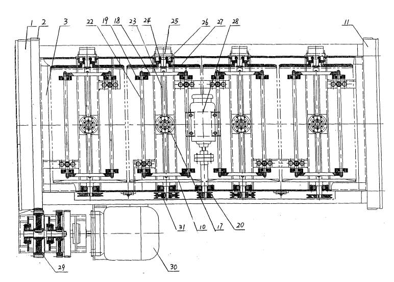 本发明的闭口桶刷洗装置包括摆动电机30 和至少一组工作台架3,主视图如图1所示,图2 为带有一组工作台架的闭口桶刷洗装置的示意图,图3 为带有两组工作台架的闭口桶刷洗装置的左视图,在每个工作台架3 的两端分别连接有支撑套1、11,每个支撑套的下侧分别通过固定在底座上的支架21、轴14、轴承13 设置有自由转动的支撑轮12,一端的支撑套通过传动机构和减速机构与摆动电机连接。