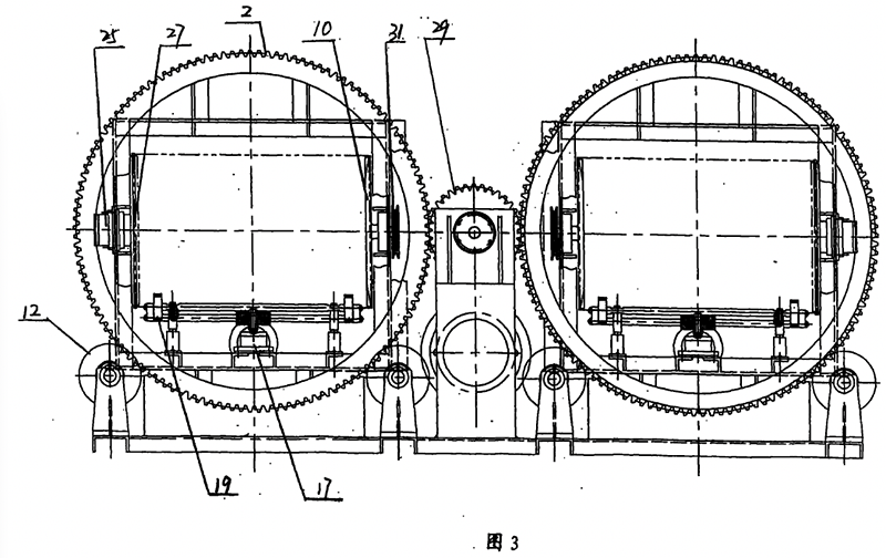 图3 为为带有两组工作台架的闭口桶刷洗装置的左视图。