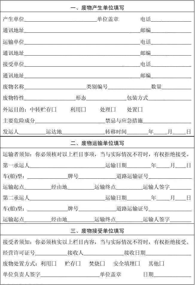 转移联单的第二第三部分是运输单位跟处置单位的信息、包括车辆的车牌、道路运输证号、处置单位的经营许可证号等信息,需要注意的是转移联单必须按照实际情况填写。