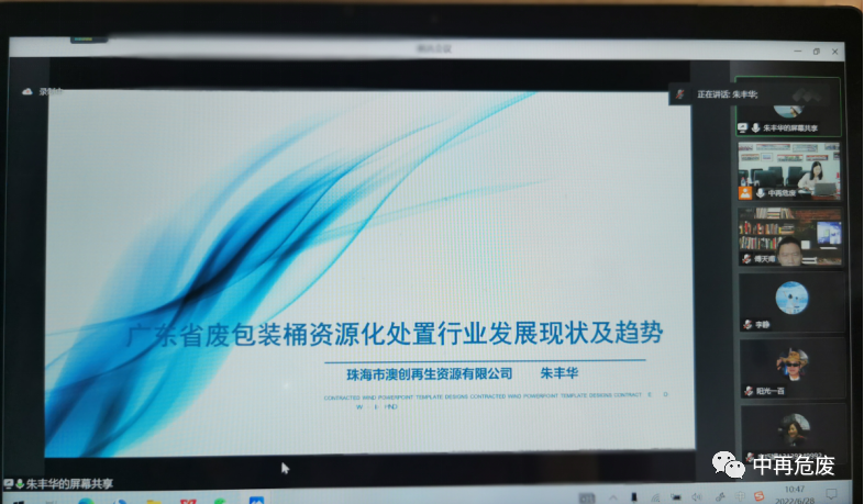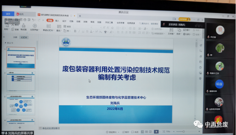 2022年6月28日上午,中国再生资源回收利用协会危险废物专业委员会以线上形式组织召开了《废包装容器利用处置污染控制技术规范》团体标准(下称本标准)项目启动会。会议邀请了生态环境部固体废物与化学品管理技术中心正高工刘海兵博士、中国钢桶包装网高级工程师辛巧娟、山西省生态环境保护服务中心高级工程师李宇亮、湖州金洁静脉科技有限公司副总经理高骏、珠海市澳创再生资源有限公司董事长朱丰华共同对本标准行业发展现状、趋势、问题和建议进行交流。来自环境管理部门、废包装桶产生企业、再生清洗企业、危废处置企业、科研院所、行业组织、投融资机构等相关单位的90多位代表参加了本次会议。