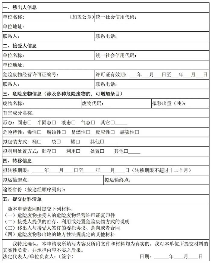 危险废物跨省转移申请单(样式)