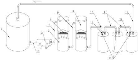 在进行清洗时,泵体2抽取原料筒1中的高纯物料,物料通过第一管体6进入泵体2,然后通过第二管体7进入到第一过滤筒3内部顶端处,通过第一过滤筒3内的过滤网8进行过滤,然后通过第三管体9进入到第一过滤筒3内部顶端处,通过第二过滤筒4内的过滤网8进行过滤,然后通过第四管体10进入到位于最左侧的包装桶5中,通过在三个包装桶5流过,通过第六管体12回流到原料筒1,物料进行循化流过时,会带走包装桶5中需要清洁的物质,通过反复循化,通过过滤网8进行过滤,实现清洗,清洗过程,处于全封闭状态下,不与空气接触,减少杂质,水分混入,并提高整个生产过程的安全性,减少人工清洗的繁琐性;