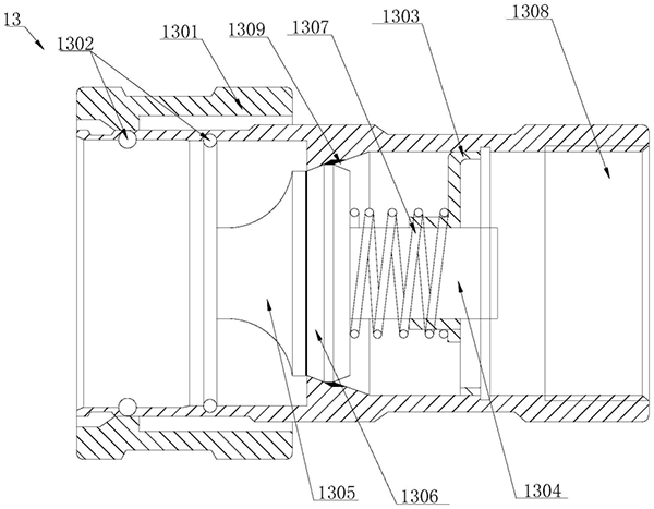 所述母头13包括母头外套1301、第一密封圈1302、第一固定导向座1303、第一导向柱1304、第一单向顶针座1305、第二密封圈1306、第一弹簧1307以及第三密封圈1308,所述母头外套1301的一端内壁设置有第一密封圈1302,所述母头外套1301的另一端设置有第三密封圈1308,所述母头外套1301的内部固定安装有第一固定导向座1303,所述第一固定导向座1303与第一导向柱1304间隙配合连接,所述第一导向柱1304的一端固定连接有第一单向顶针座1305,所述第一单向顶针座1305上设置有第二密封圈1306,所述第一导向柱1304上套设有第一弹簧1307,所述第一单向顶针座1305与第一固定导向座1303之间通过第一弹簧1307弹性连接,所述母头外套1301的内部设置有内口1309,所述第一单向顶针座1305与内口1309嵌合连接,母头13的左侧与管道或包装桶5进行连接,通过第一密封圈1302提供连接的密封。