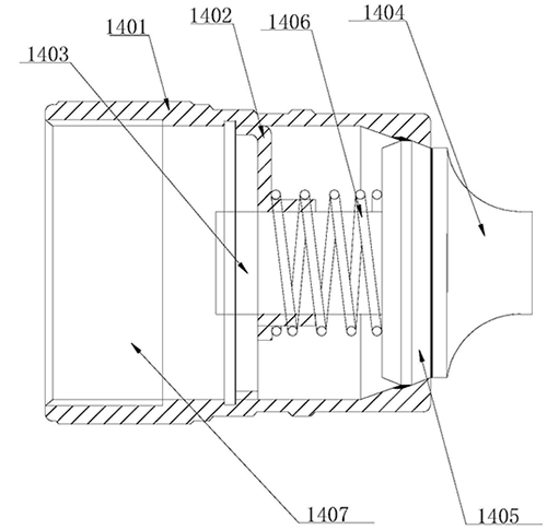 所述公头14包括公头外套1401、第二固定导向座1402、第二导向柱1403、第二单向顶针座1404、第四密封圈1405、第二弹簧1406以及第五密封圈1407,所述公头外套1401的内部固定安装有第二固定导向座1402,所述第二导向柱1403与第二固定导向座1402间隙配合连接,所述第二导向柱1403的一端固定连接有第二单向顶针座1404,所述第二单向顶针座1404与公头外套1401的一端嵌合,所述第二单向顶针座1404上设置有第四密封圈1405,所述第二导向柱1403上套设有第二弹簧1406,所述第二固定导向座1402和第二单向顶针座1404之间通过第一弹簧1307弹性连接,所述公头外套1401的一端内壁上设置有第五密封圈1407。