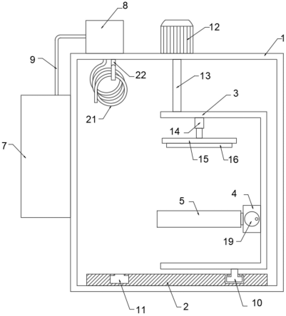 图例说明:1、安装框体;2、固定圆盘;3、U型架;4、安装架;5、弧形夹板;6、活动板;7、储液箱8、泵体;9、进液管;10、移动滑块;11、环形槽;12、驱动电机;13、驱动轴;14、伸缩气缸;15、压板;16、第一橡胶垫;17、第二橡胶垫;18、螺纹杆;19、转轮;20、限位杆;21、出液软管;22、收纳挂钩。